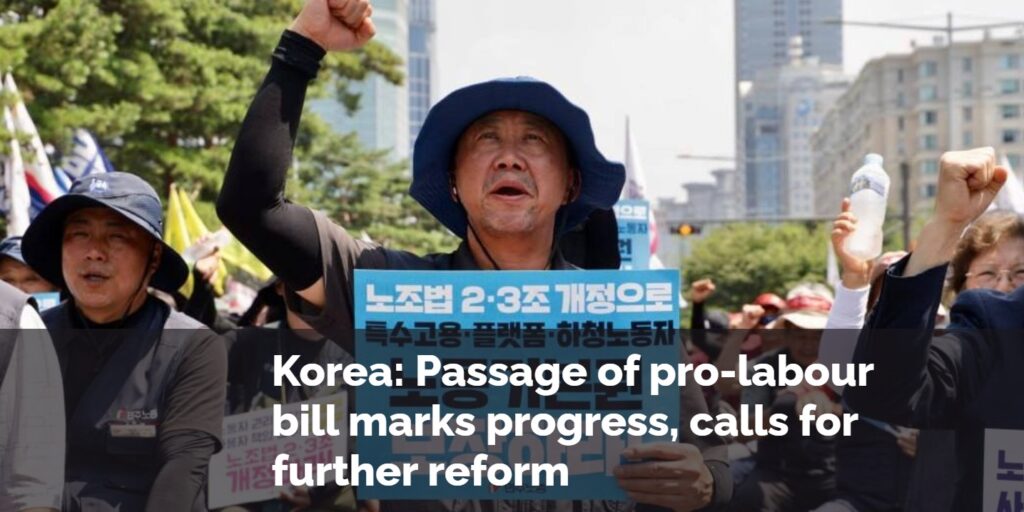 韓国の労働組合は、労働組合・労働関係調整法(TULRAA)の可決を正しい方向への有意義な一歩と認めながらも、8月29日に政府に対し、労働法改革のさらなる推進を要請した。