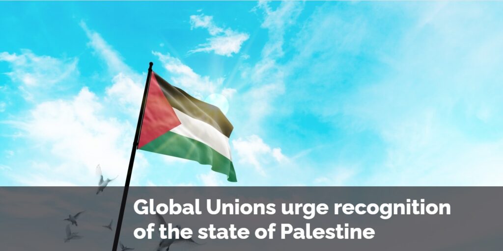 声明――ニューヨークでの来る国連総会の直前に、下記に署名したグローバル・ユニオンは、国際労働組合総連合(ITUC)、グローバル・ユニオン・フェデレーション(GUF)およびOECD労働組合諮問委員会(TUAC)を通して全世界で2億人以上の労働者を代表し、パレスチナ国家承認への各国政府のますます強まるコミットメントを全面的に支持する。